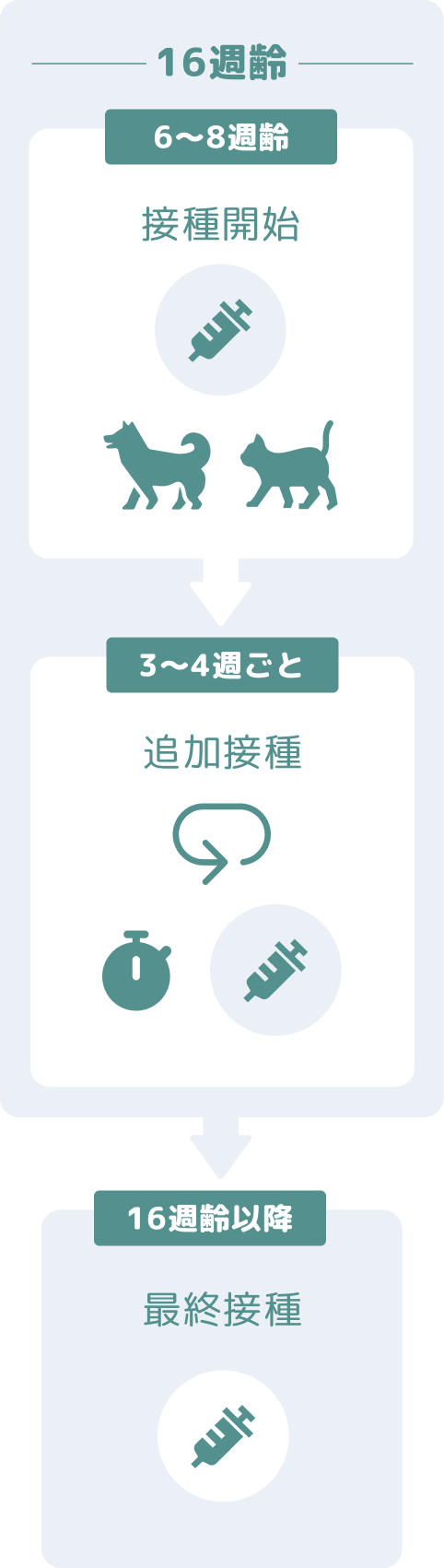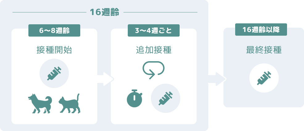 6〜8週齢から接種を開始し、3〜4週ごとに追加接種を行います。